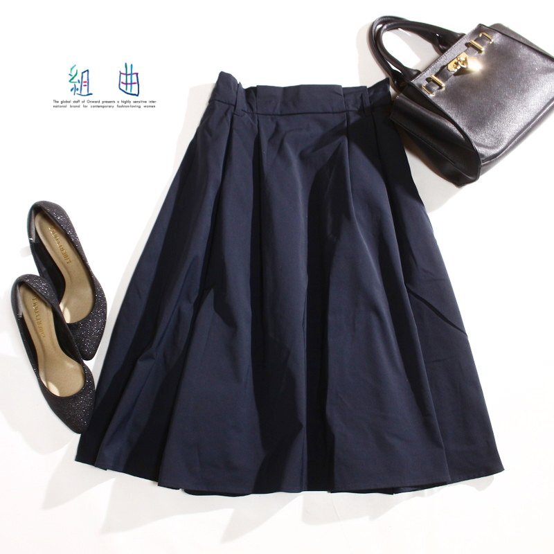 > 美品 組曲 KUMIKYOKU 株) オンワード樫山 通年 ポリエステル100% タックフレアスカート S2 ネイビー 紺 ミモレ丈スカート オフィス 通勤