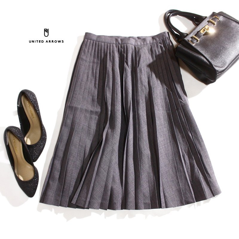 > 美品 ユナイテッドアローズ UNITED ARROWS ウール混 プリーツスカート S ミモレ丈 オフィス 通勤 フォーマル 毛30% グレー スーツ 綺麗め