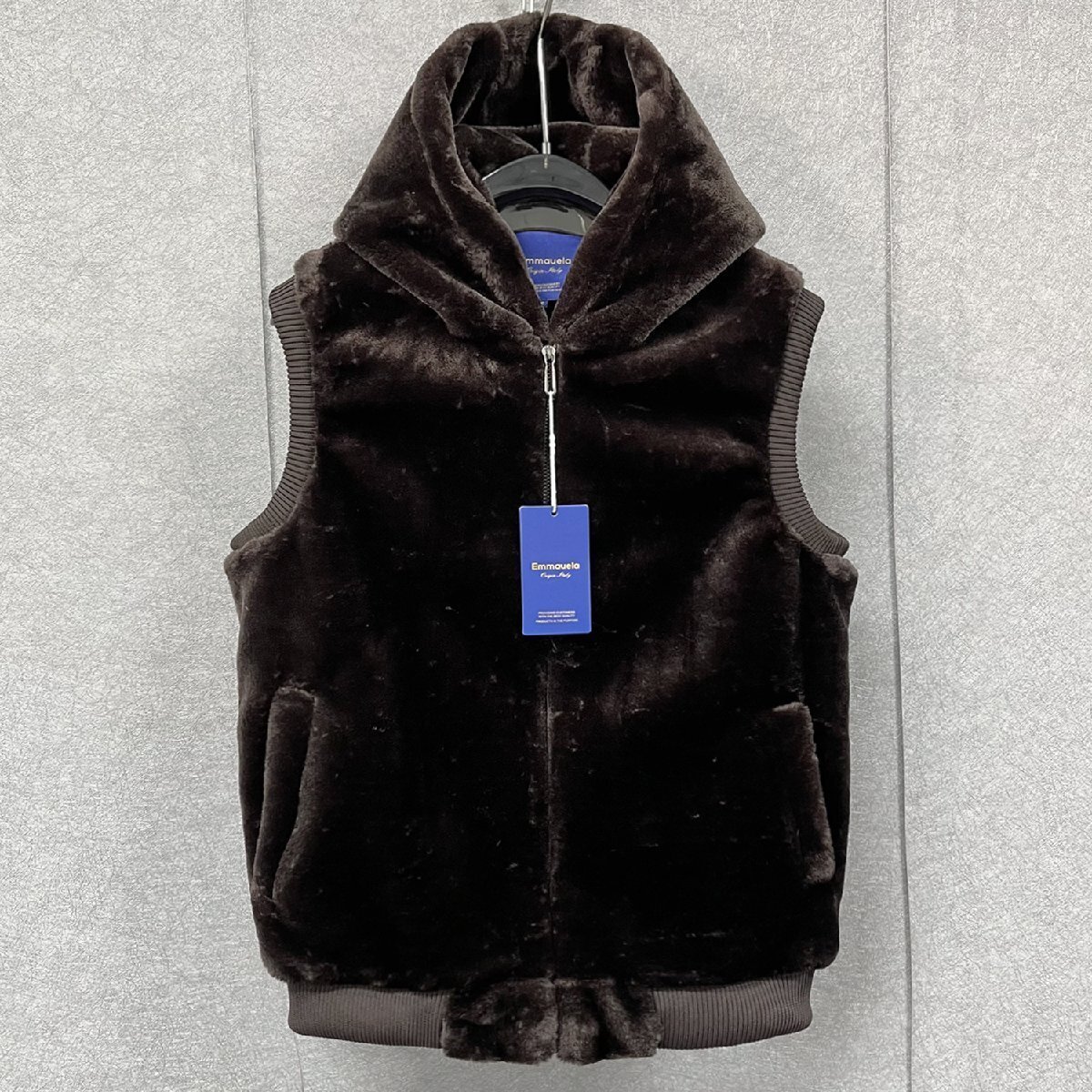 - 上級・ミンク/カシミヤ混・毛皮ファーベスト 定価10万◆Emmauela・イタリア・ミラノ発◆防寒 モコモコ フード付き 男女兼用 L/48サイズ