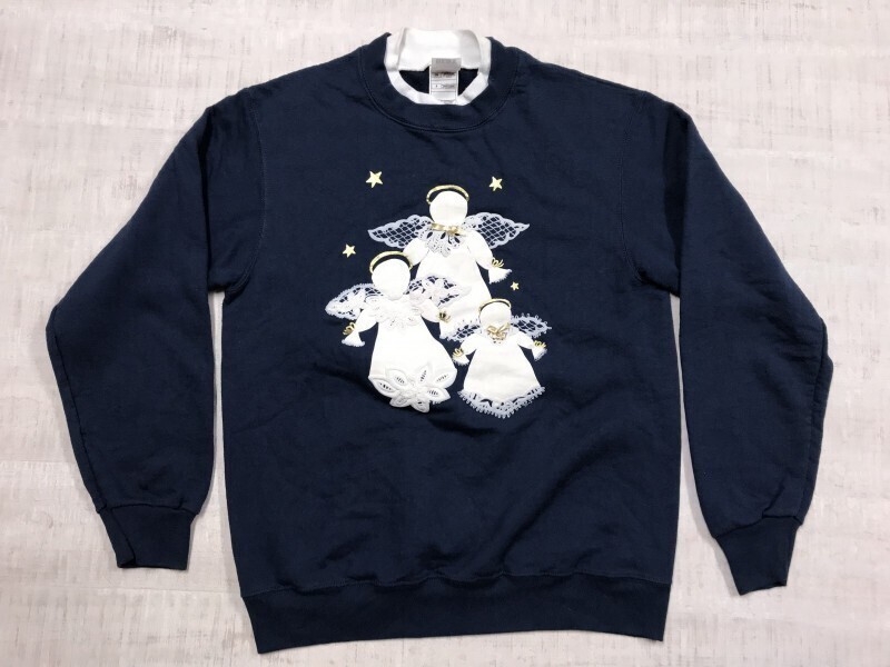 > FRUIT OF THE LOOM レトロ カントリー 古着 エンジェル発泡プリント メタリック レイヤード風 スウェット トレーナー レディース S 紺