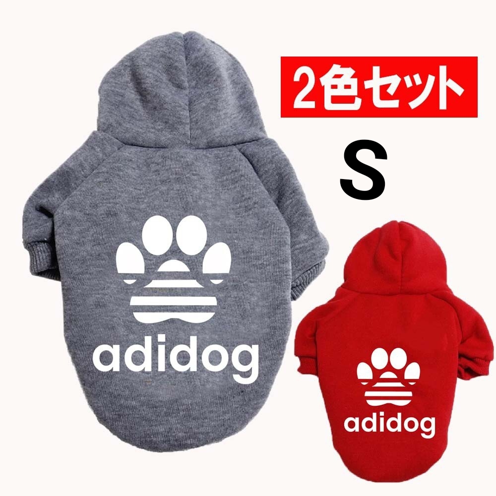 - S レッド、グレー 犬服 2色セットアディドッグ肉球パーカー 裏起毛パーカー裏起毛あったかい