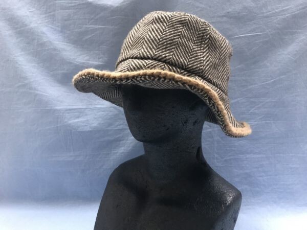 - レトロ カントリー モード ヘリンボーン ツイード トリム ニット バケットハット 帽子 レディース 56cm 茶色