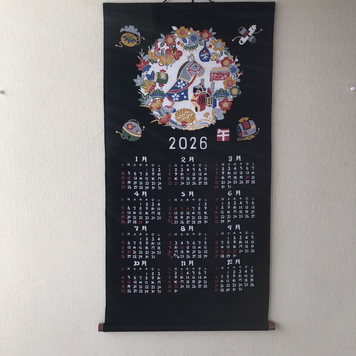- 掛け軸カレンダー 2026年 タペストリー 和柄 干支カレンダー 午年 馬 紺系 綿の生地 日本製 インテリア ギフト 年賀 正月