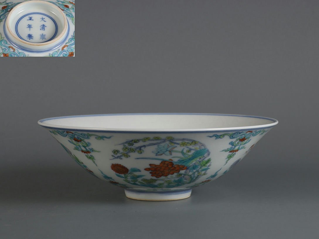 - ▼渡鶴羽▼H7225清時代 斗彩四季団花紋斗笠碗・時代物・古陶磁・古賞物・旧家買出品