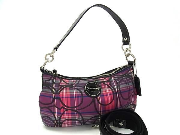 > 1円 COACH コーチ F15463 シグネチャー ナイロン×レザー チェック柄 ラメ 2WAY クロスボディ ショルダー ハンドバッグ パープル系 BQ1739