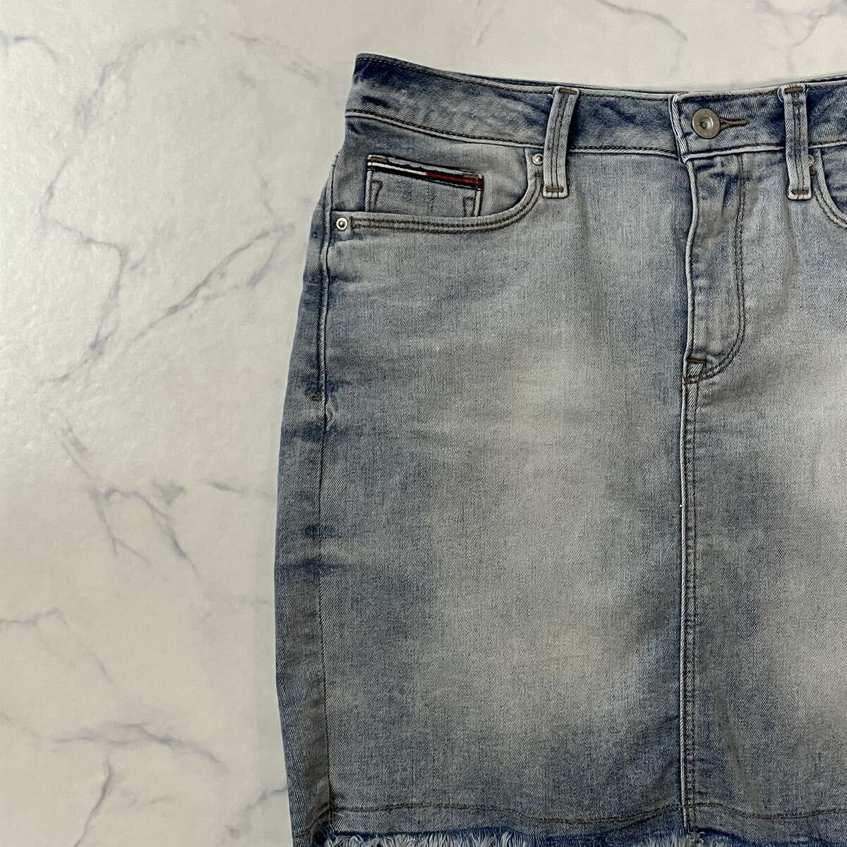 > 美品 HILFIGER DENIM ヒルフィガーデニム ストレッチ カットオフ ジップ ポケット ボタン デニム ひざ丈 スカート ライトブルー S