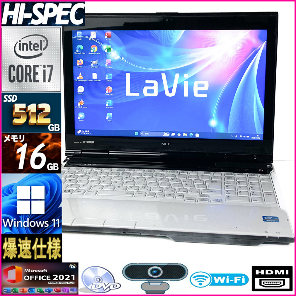 - 最強i7【メモリ16GB/新品SSD512GB/Core i7-3.30GHz】Win11/Office2021/人気NECノートパソコン/YAMAHAサウンド/Webカメラ/Wi-Fi/筆ぐるめ