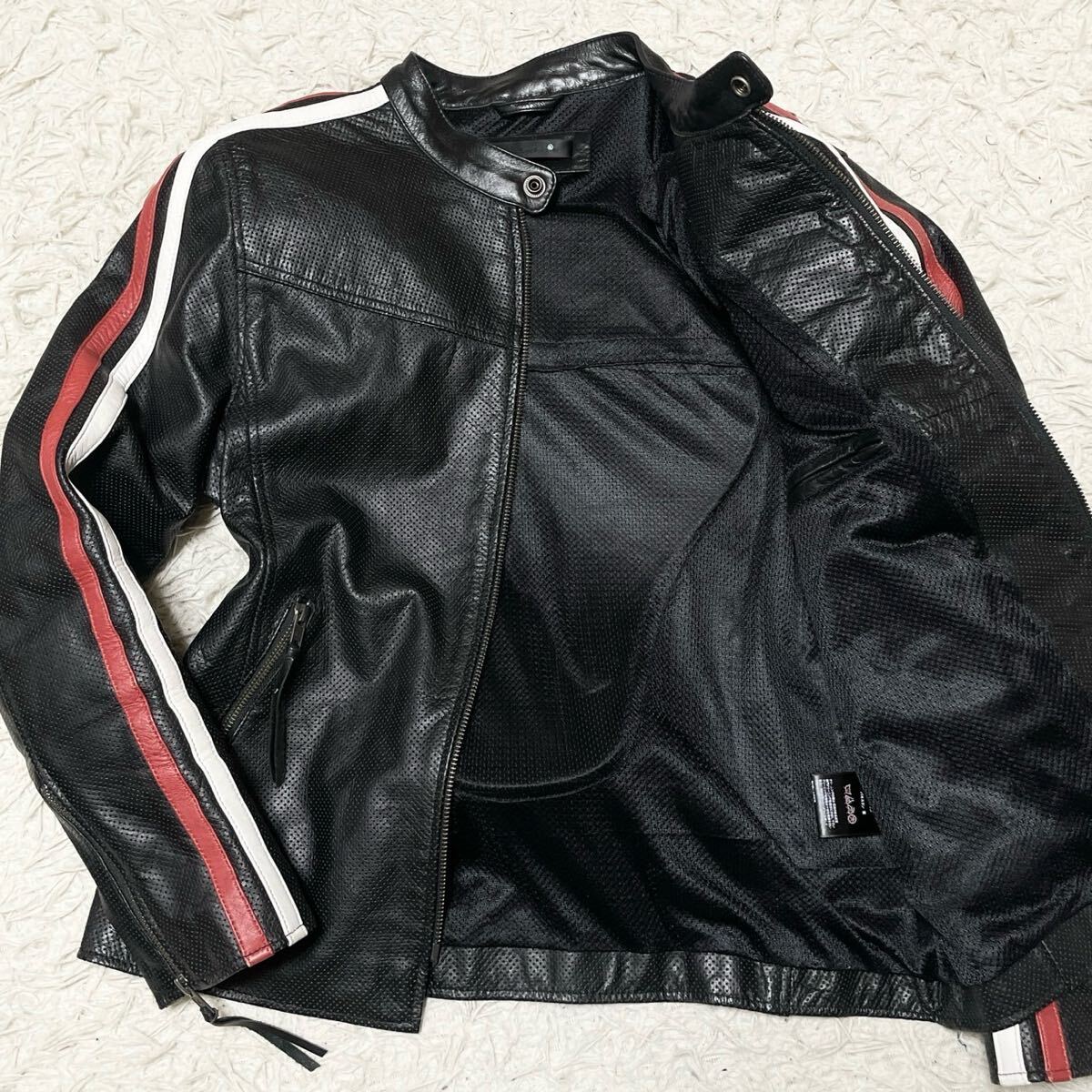 - プロテクター付き◎Lサイズ◎Liugoo Leathers レザー ライダースジャケット メンズ バイカー ブラック 黒 牛革 リューグーレザー 赤 白
