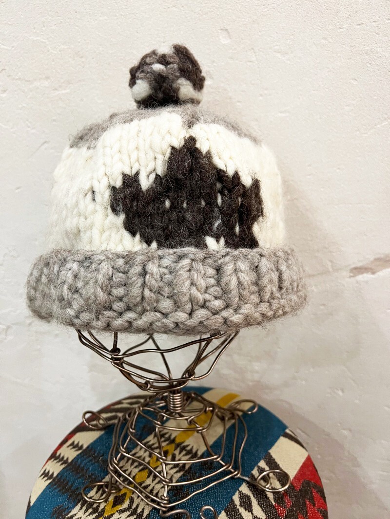 > 1769★カナダ製 ハンドニット カウチンニット帽 帽子 ニット グレー×ホワイト系 ユニセックス 80's-90's 古着 USED ★