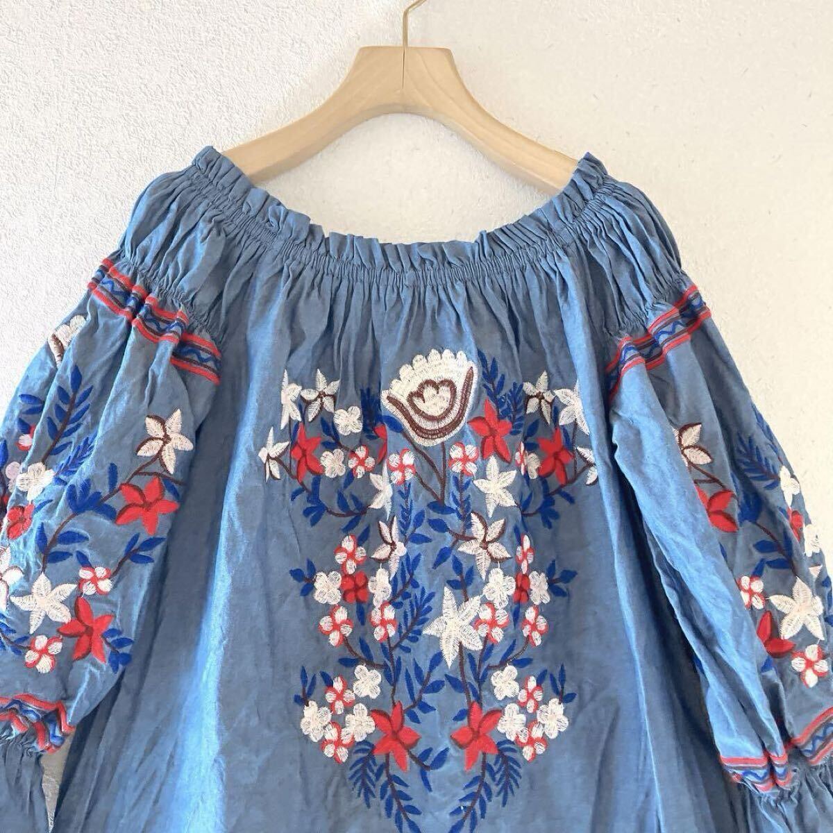 - 100円スタート TrendDressCode 花柄 刺繍 オフショルダー チュニック デニム風 エスニック ナチュラル ゆったり 体型カバー