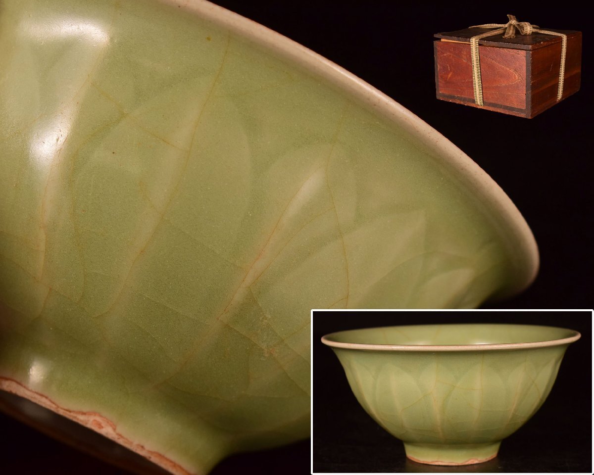 U263 【泉美】唐物青磁 蓮弁茶碗 抹茶碗 茶道具 木箱入拍卖