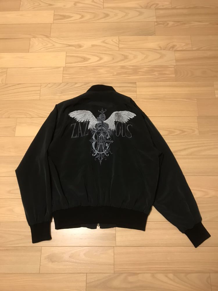 > 着用少な目.良品☆摩天楼 サイズF/ L並 MA-1型ブルゾンジャケット・オールブラック黒! レーヨン風サラサラ生地 背面ZAZOUS ビッグ刺繍入