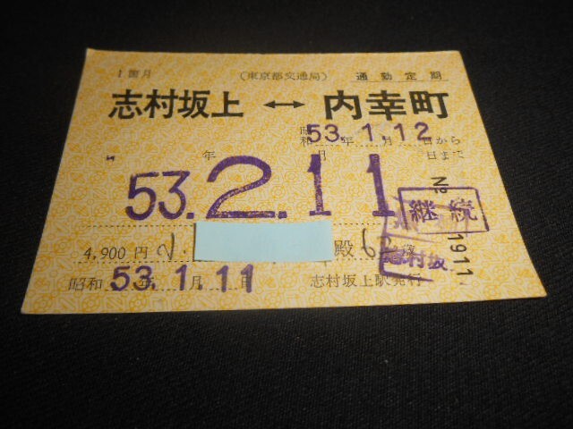 - 東京都交通局 通勤定期券 志村坂上ー内幸町 無効印裏回収印 昭和年 送料110円