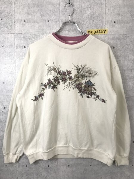 - CAVELL REED レディース 裏微起毛 フラワープリント スウェットカットソー 大きいサイズ XL 白ピンク