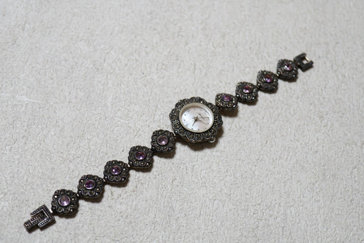 - F2153 海外製 マーカサイト アメジスト シェル文字盤 宝石 レディース 腕時計 アクセサリー ヴィンテージ ブランド クォーツ 不動品