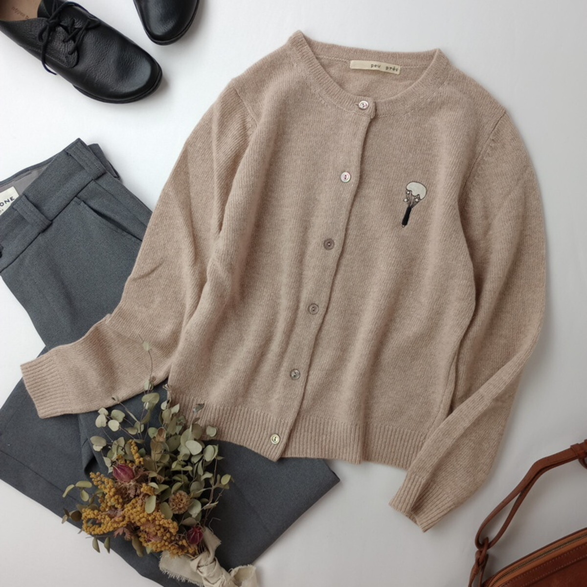 > peu pres プープレ「今日のわたしは絶好調♪」ホイップ柄 ロゴ ニット カーディガン 長袖 アンゴラ ウール 毛 混 Free ベージュ(26M+7717)