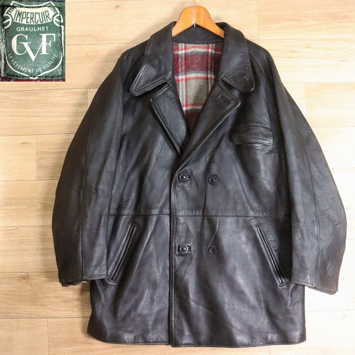 > G8S/Y5.13-5 80s ビンテージ フランス GVF ダブルブレスト レザーカーコート 本革 レザージャケット フレンチ ヴィンテージ