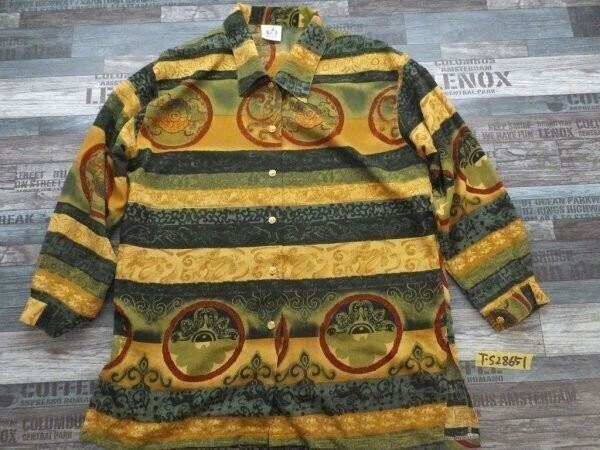- 萬美 WANMEI レディース 肩パッド付き 総柄 レトロ とろみシャツ 緑オレンジ