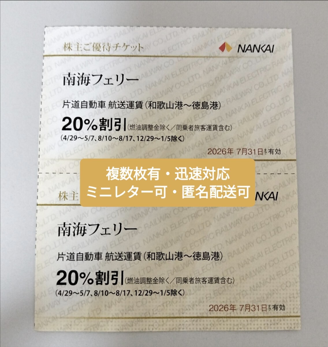 - ★南海フェリー 片道自動車 航送運賃20%OFF割引券1枚★南海電鉄株主優待券★ 和歌山港~徳島港