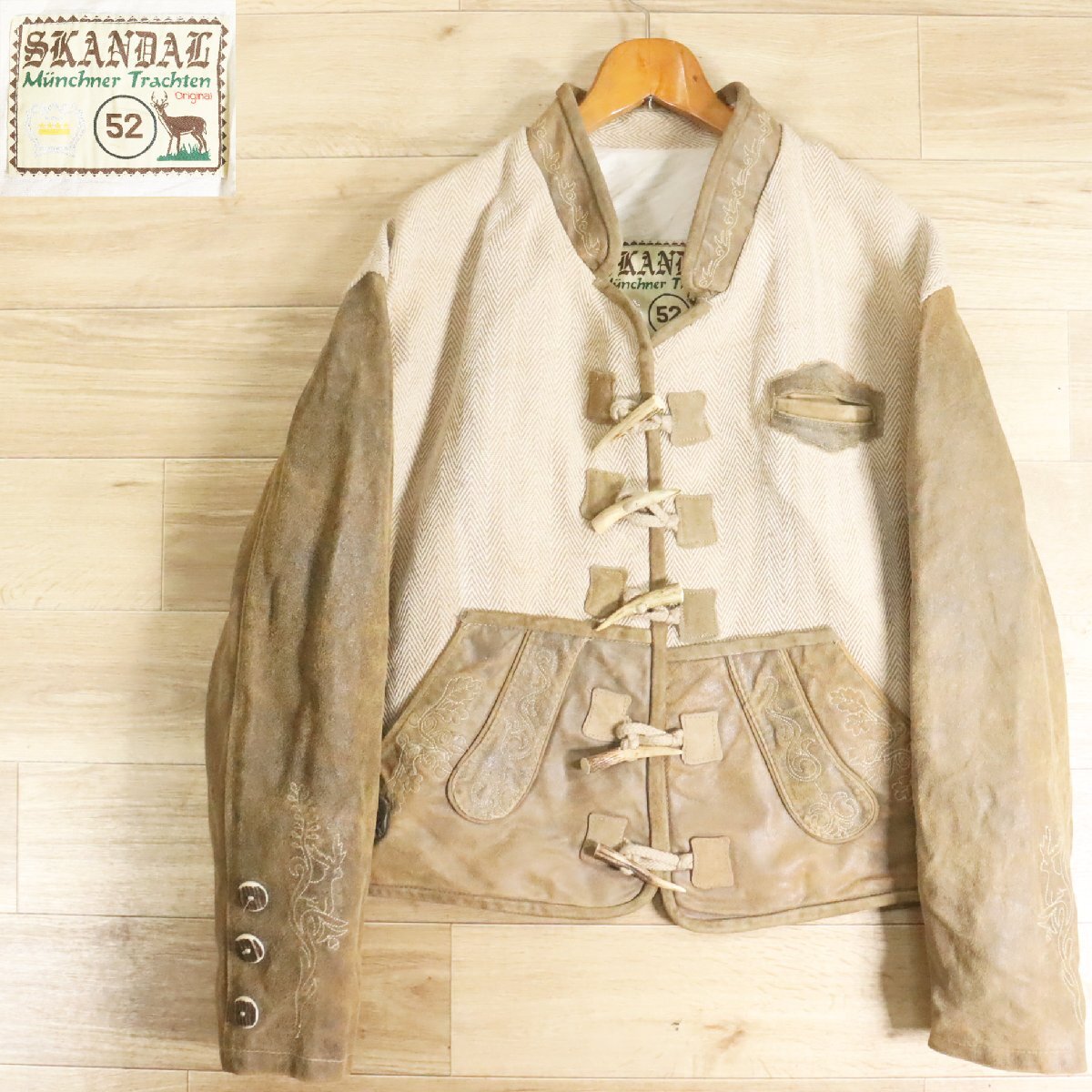 > B19R/Y6.2-11 ユーロ古着 SKANDAL Munchner Trachten チロリアン ハンティングジャケット レザー切り替え 本革 刺繍 スタンドカラー