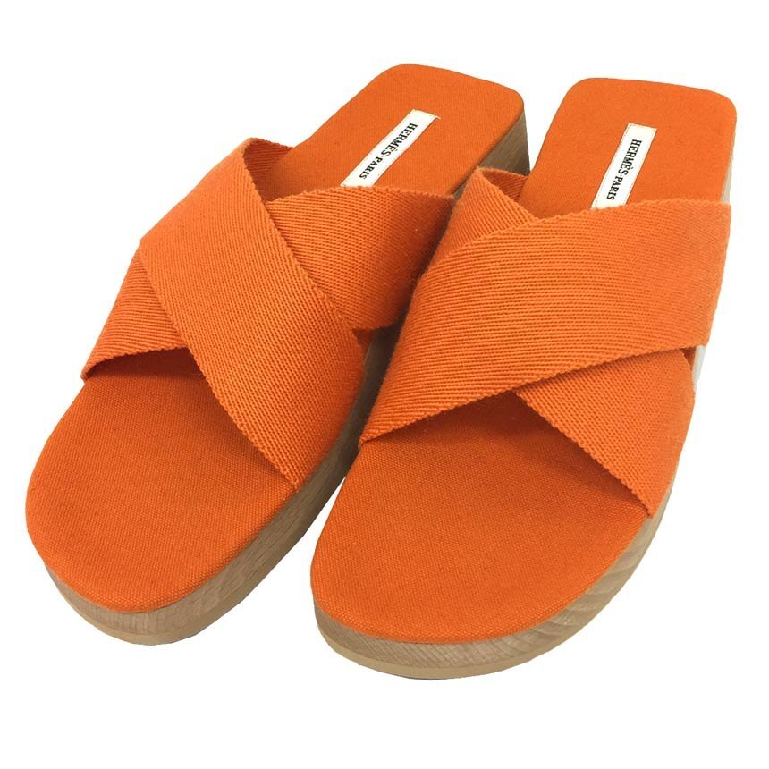 - 送料無料 セール HERMES エルメス ウッドソール クロスバンド サンダル 靴 シューズ 未使用 新品 サイズ36 23cm オレンジ 箱付き aq8549