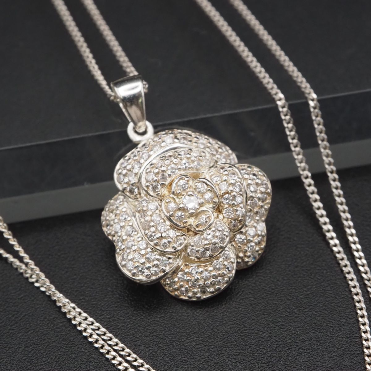 - H615 ダイヤモンド風 925刻印 ペンダント ネックレス 薔薇 バラ ローズ パヴェ デザイン シルバー