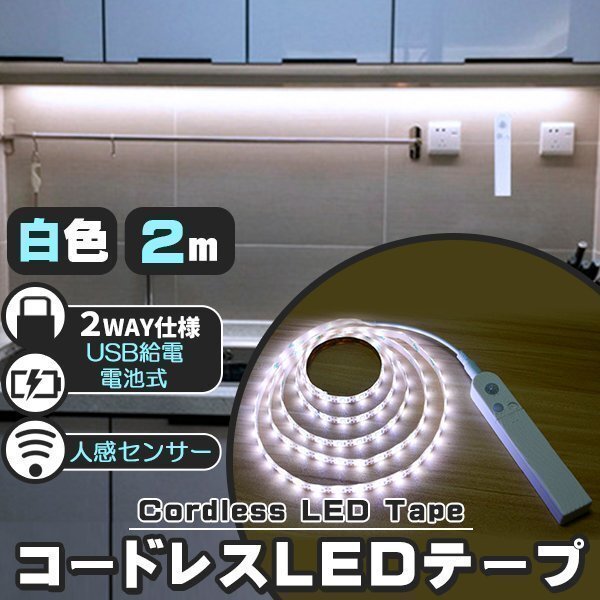 - ★ LED テープライト 人感センサー付き 2m 白色 昼光色 USB式 電池式 充電不要 LEDテープ 階段 間接照明 棚下照明 フロアライト 足元灯