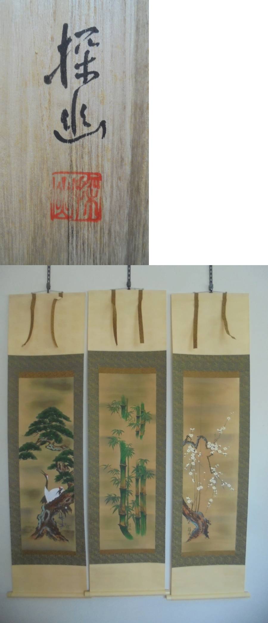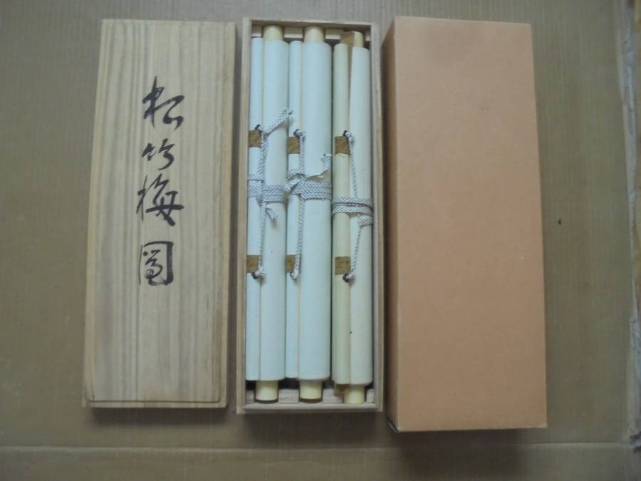 - 模作 松竹梅図軸 3本セット 探幽銘 紙・桐共箱 レトロ 良品 7035 掛軸 書画 日本画 京都雲屋