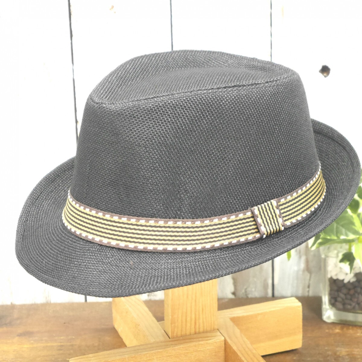- 全国一律送料450 リネン風 麻 ストライプベルト フェドラハット ブラック シンプル 男女OK ハット パナマ ボルサリーノ 中折れ