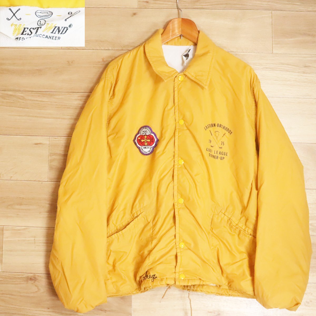 > &2R/R6.9-2 70s ヴィンテージ WEST WIND コーチジャケット プリント チェーンステッチ ブルゾン L イエロー アメリカ古着