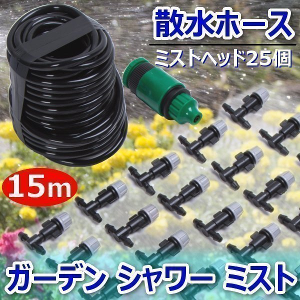 > ▼ミスト 散水 ホース 15 m ガーデン 庭 バルコニー シャワー ノズル 25ヶ 花壇 水まき アタッチメント 付属 延長可能 ガーデニング 用品