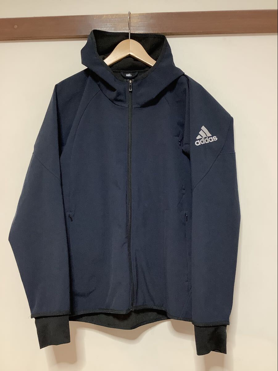 - と1770 adidas アディダス ソフトシェルジャケット フーデット O ネイビー 裏起毛 ロゴプリント