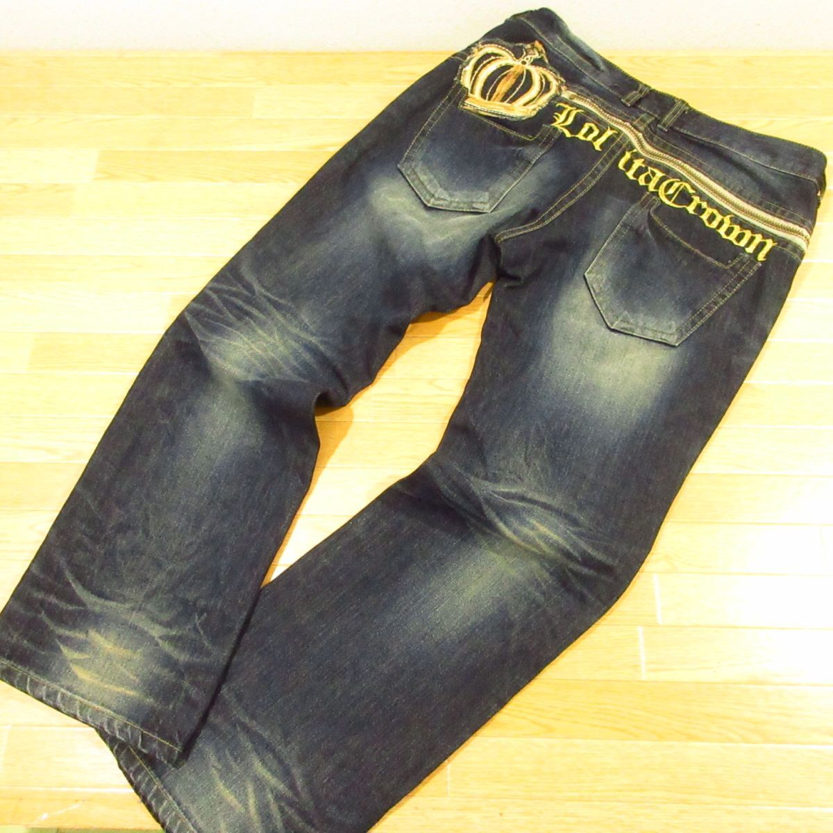 - ◎良品!LOLITA JEANS ロリータジーンズ ブーツカット デニムパンツ USED加工 金刺繍ロゴ 王冠ワッペン メンズ 濃紺 Lサイズ◆PA4567