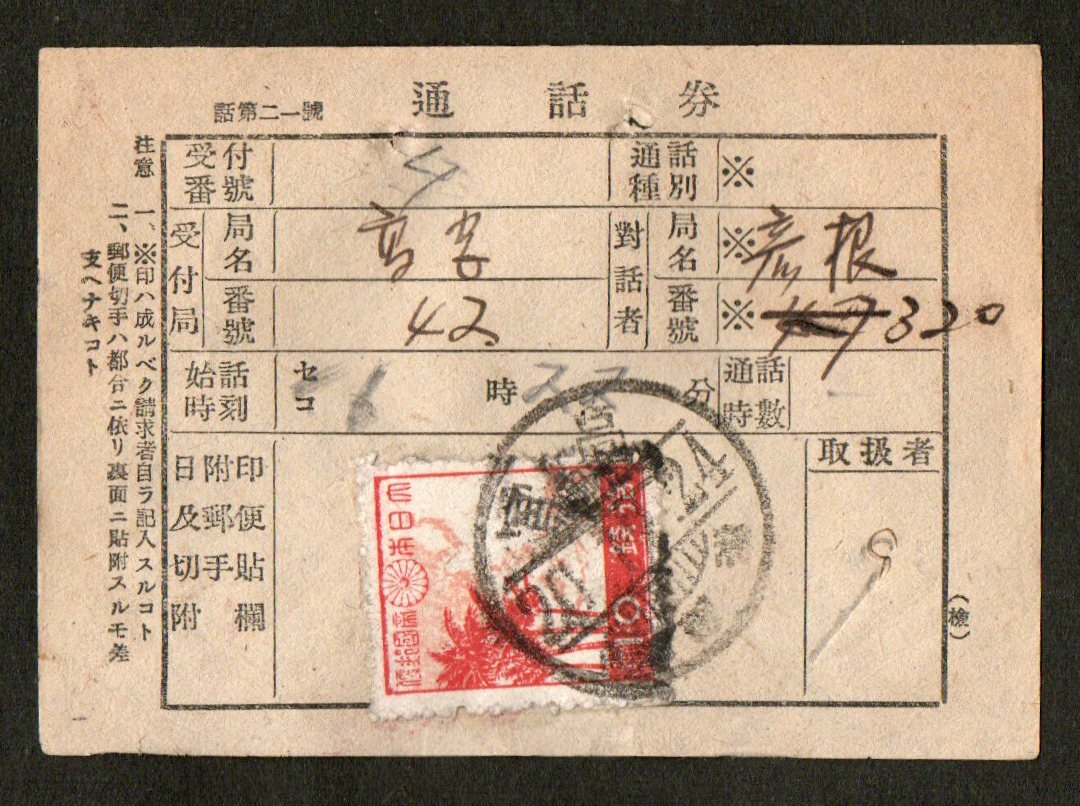 - 終戦直後通話券使用例 2昭10銭貼 高宮 20.12.24 滋賀県