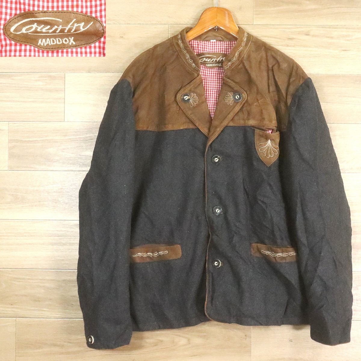> #6T/O10.14-5 ユーロ古着 レザー切り替え ウールチロリアンジャケット 本革 58 ウールジャケット 刺繍 ジャンパー ブルゾン
