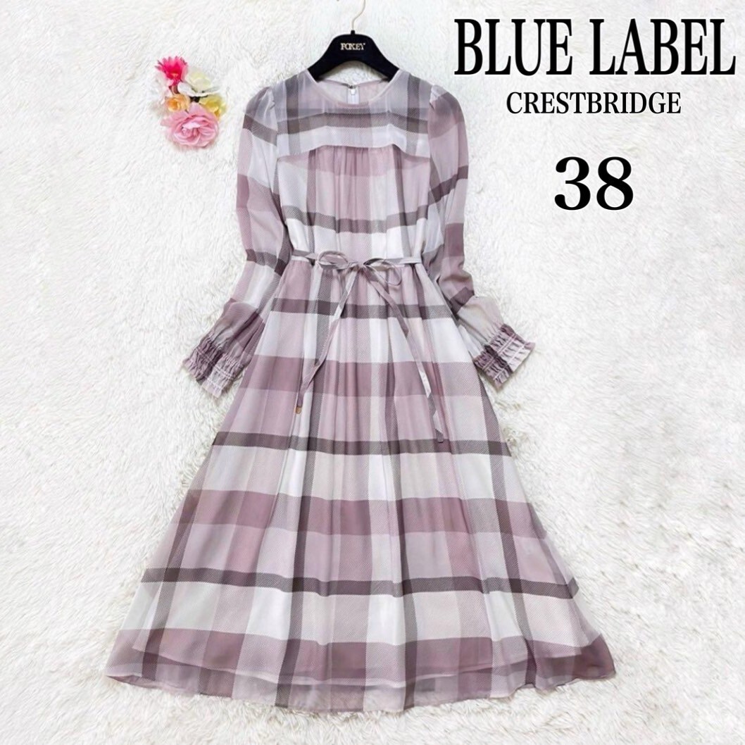 > ブルーレーベル クレストブリッジ チェック シフォン プリント ワンピース 未使用 タグ付き ピンク 38 ミディ 長袖 Aライン フレア リボン