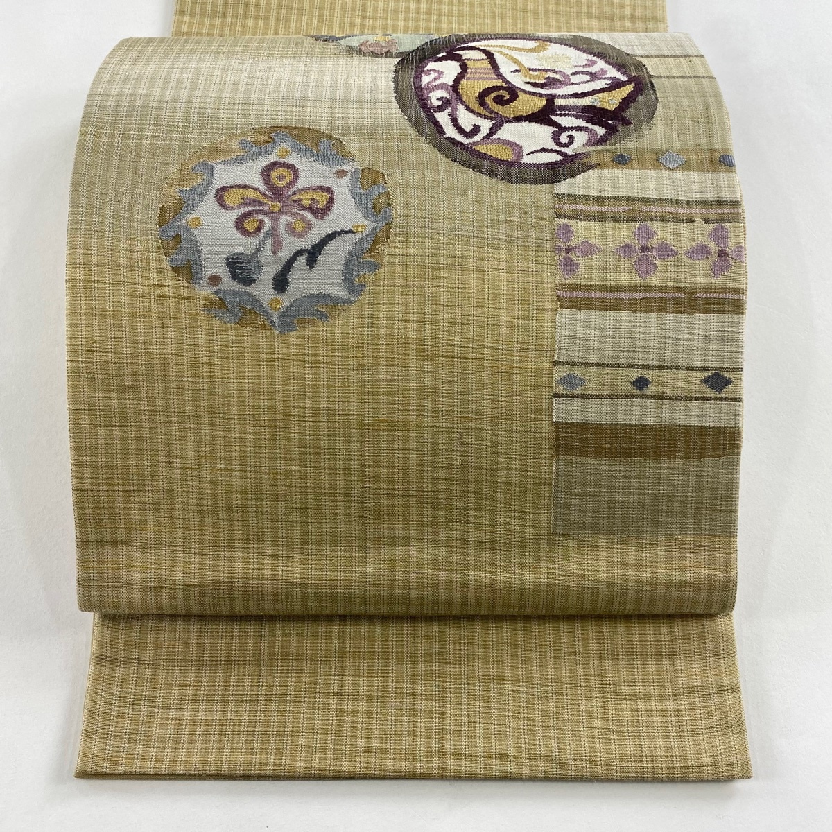 > 【美品】 袋帯 秀品 紬地 鳥 草花 金銀糸 ベージュ お太鼓柄 正絹 【中古】