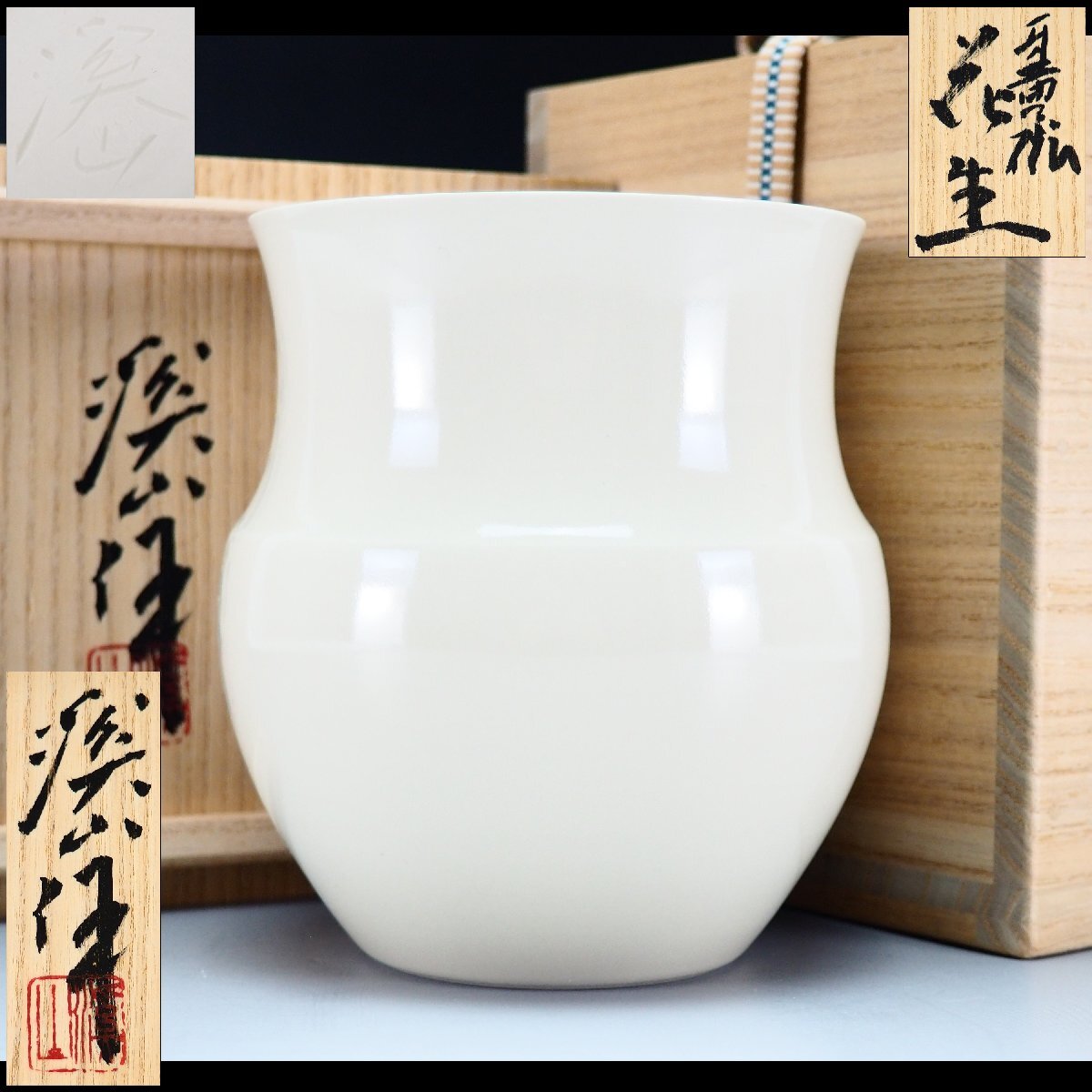 > 【治】『加藤渓山』作 牙黄磁 花生☆共箱 高さ 13cm 白磁 花瓶 壷 花入 飾壷 (検索:京焼 宮永東山 清風与平 諏訪蘇山) 本物保証 OJ14