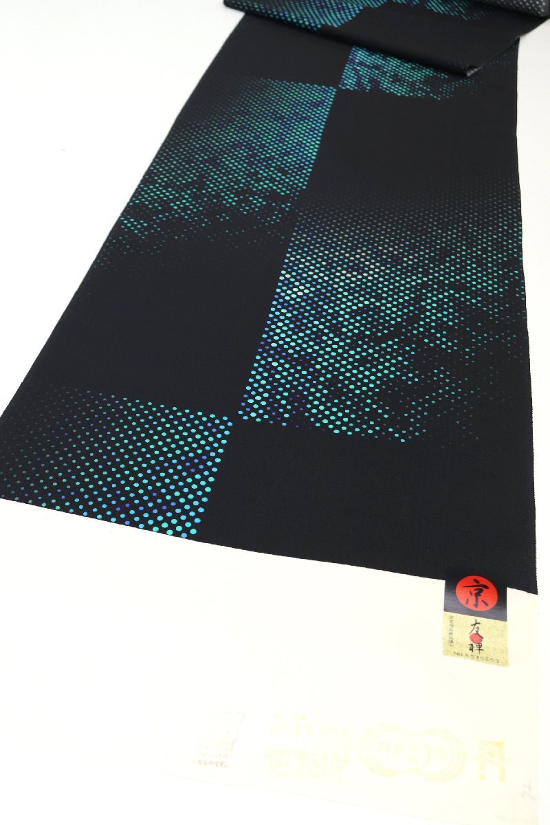 ※こちらの商品にはお仕立てはついておりません。 (布幅:36.5cm) 丹後ちりめん京友禅染め小紋着尺をご紹介致します。 京友禅振興協議会 しっとりとした上質な丹後ちりめんの生地は、黒色のお色目でございます。生地には西洋風の模様の地紋が織り込まれており、やや光沢感がございます。 全体には青色、翡翠色、水色、ロイヤルブルーのお色目で、水玉模様の大小がグラデーションのように市松状に配されております。 個性的なお着物、コートをお探しの方にピッタリでございます。 -状態・素材:正絹 -落款・証紙:京友禅振興協議会 -参考着用年代: 20代~幅広い年代でお召しいただけます。 -着用時期 :10月~5月