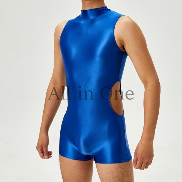 > 169-216-25 メンズ ツヤツヤ サイドカット ジャンプスーツ【ブルー,Mサイズ】男性 コスプレ 光沢 サテン セクシー ボディスーツ .1