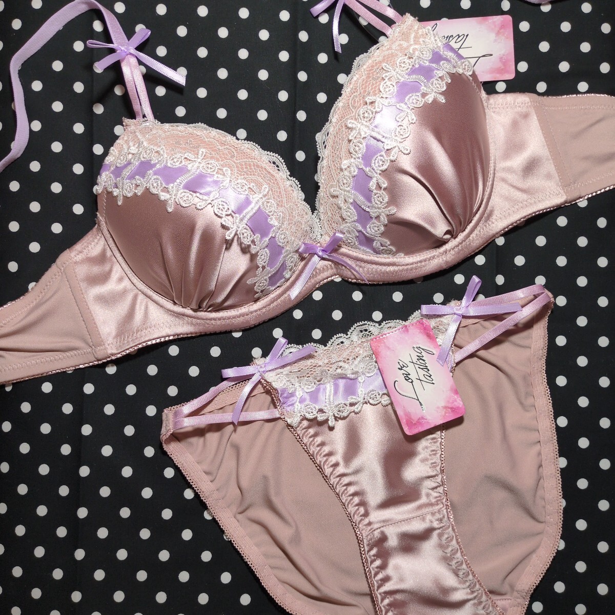 > D70☆М 艶々サテン ブラ☆Wストリングパンティ レースモチーフ&パープルサテンリボン コーラルピンク 訳あり