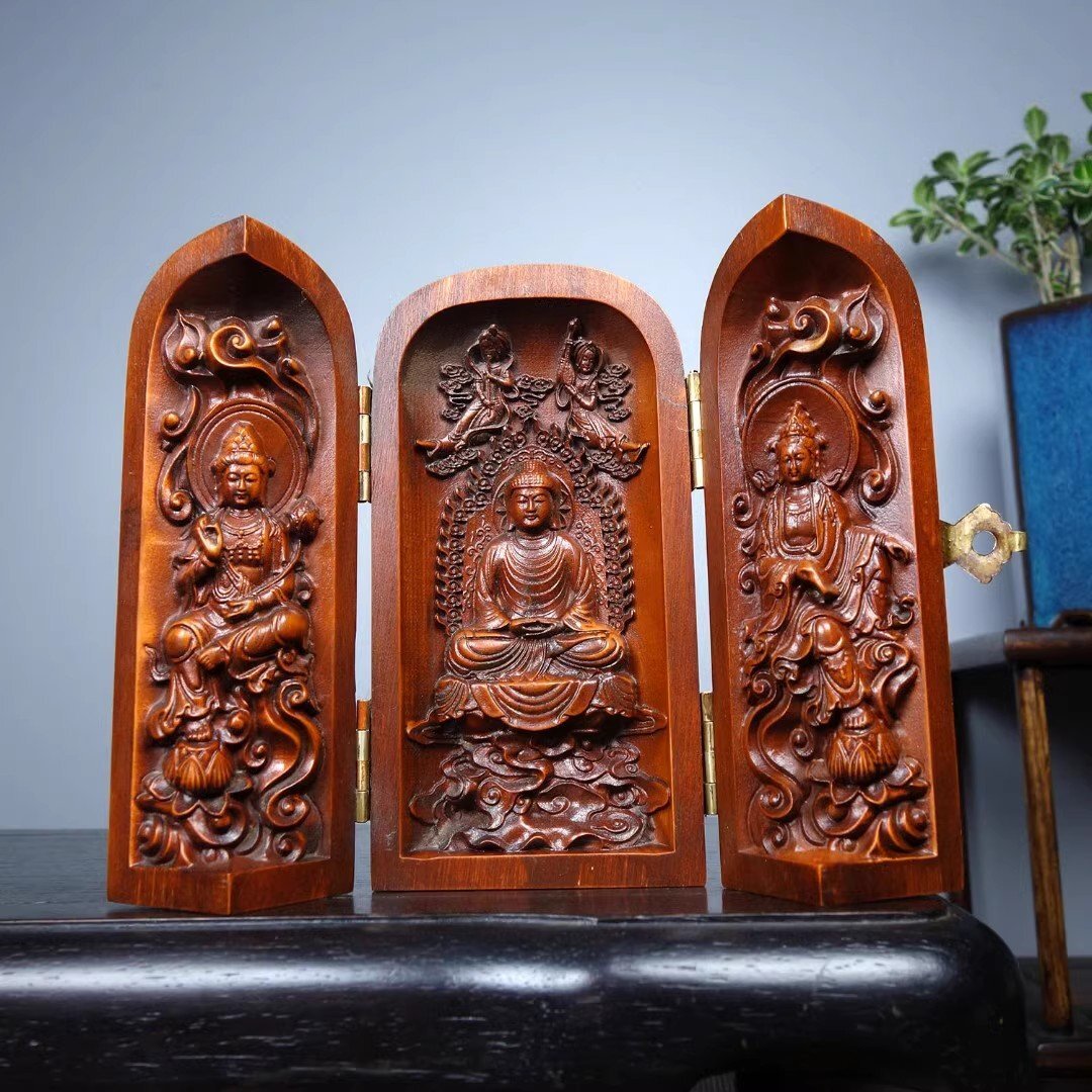- 秘蔵 三開仏 三開仏像 木彫り 立西方三聖 阿弥陀仏駅像 仏教美術 置物 【勢至菩薩 阿弥陀如来 観音菩薩】 仏壇 仏箱 仏龕 擺件 sux037