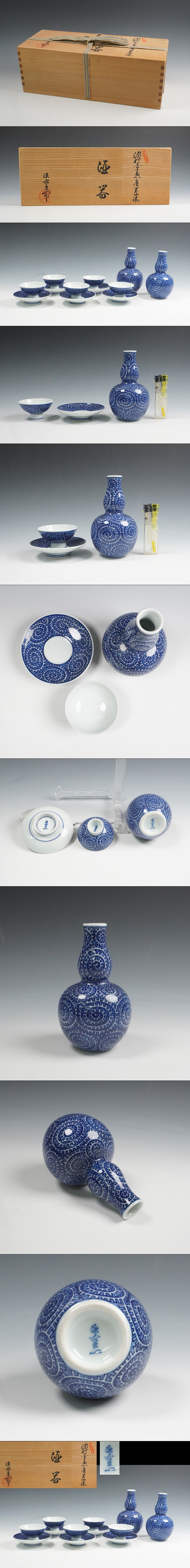 > 源右衛門 作 染付章魚唐草絵 酒器揃 徳利 猪口 盃 共箱 保証品◆13321YL