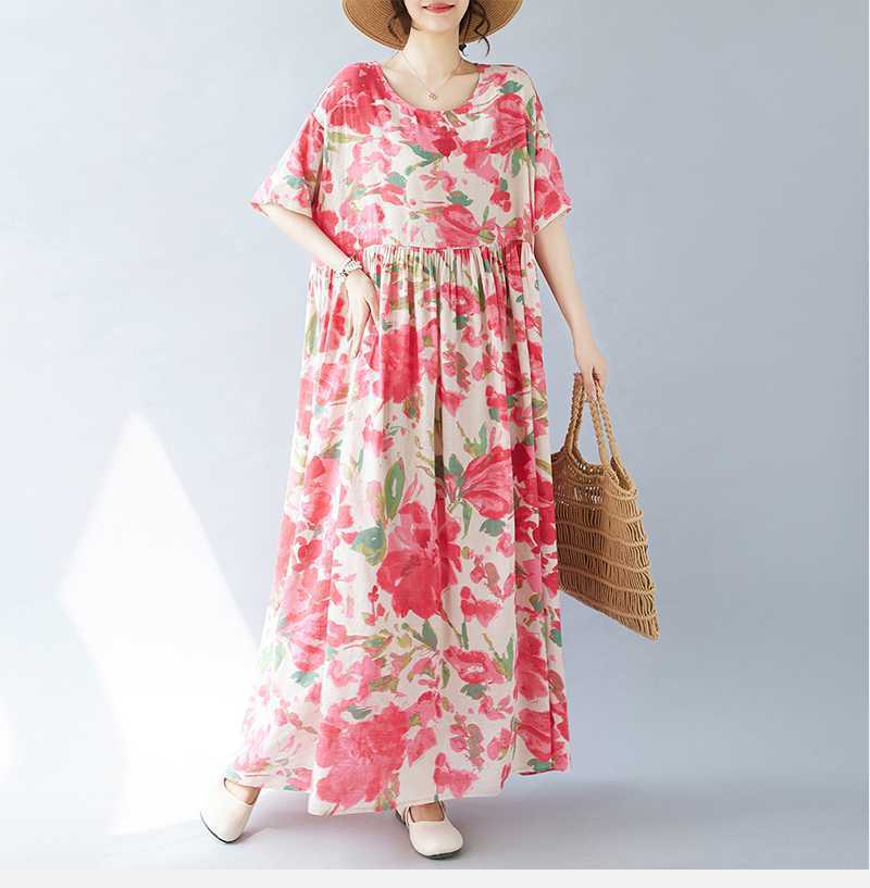 - 新入荷 ワンピース夏 きれいめ 花柄 ワンピース 半袖 ロングワンピース マキシワンピース 大きいサイズ 綿麻 ワンピースF