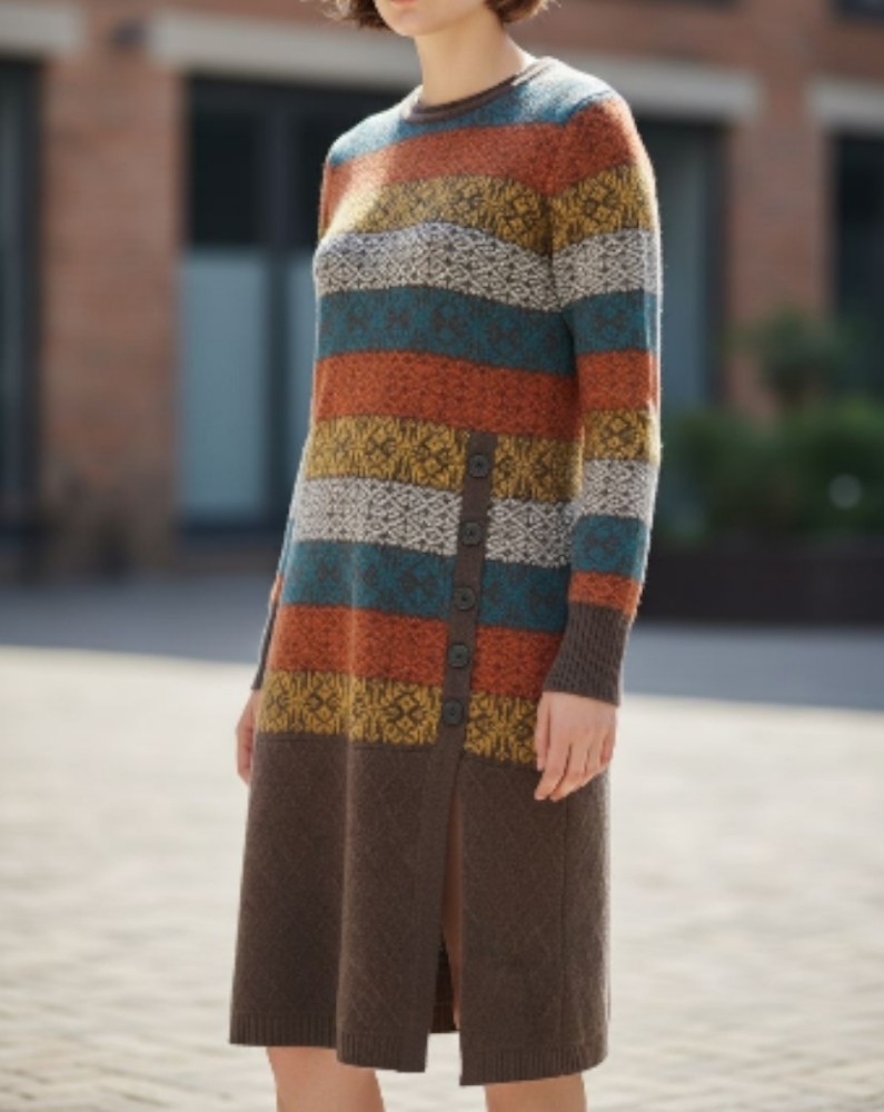 > ゆったり 着心地がいい スリット入 ニット 茶色 ブラウン チュニック トップス 個性的 エスニック 幾何学模様 厚手 冬 ノルディック柄