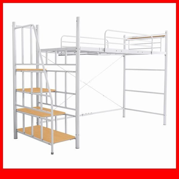 > ベッド★階段付き ロフトベット シングル/宮棚 コンセント付き/ハイタイプミ ドルタイプ 高さ調整/極太パイプベッド/ホワイト/最安値/a1