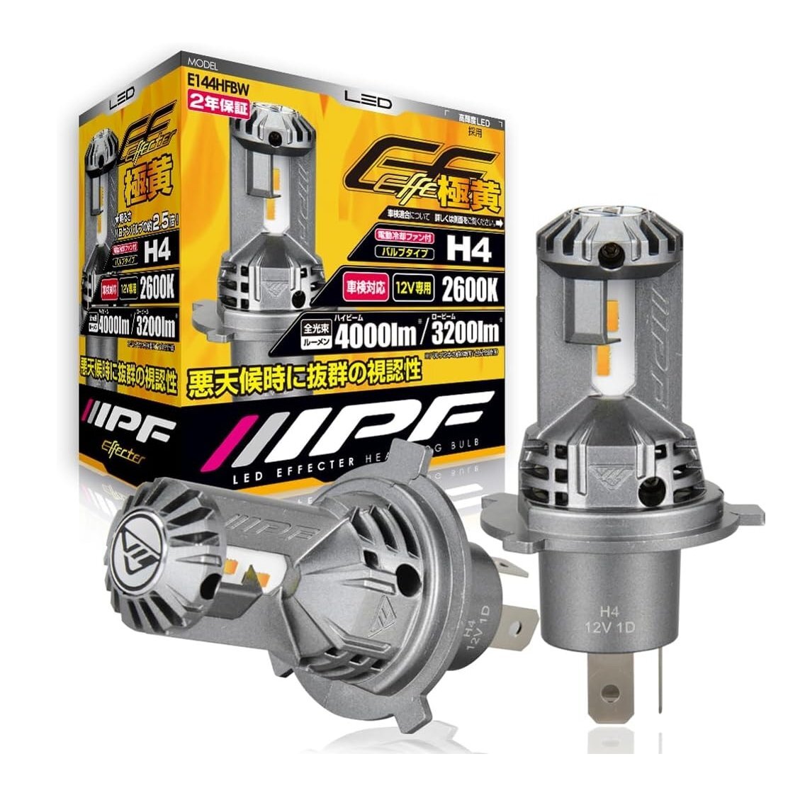 ■メーカー: IPF ■商品名: ヘッドライト フォグランプ LED 車用 H4 Hi Lo切替 4000lm 3200lm 2600K イエロー 12V用 2本入 車検対応 ドライバーユニット一体型 冷却ファン内蔵 ハロゲンサイズ型 取付簡単 Eシリーズ ■型 番: E144HFBW ■状 態: 未使用 ■定 価: ------------------------------------------------------------ セット内容: LEDバルブ 2本入り