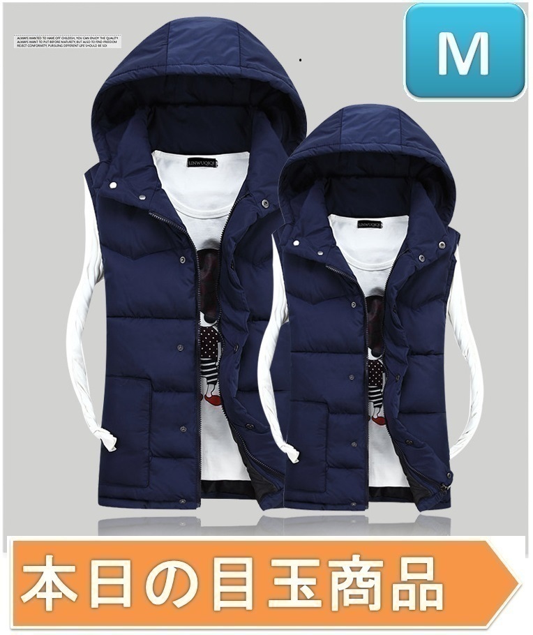 > 人気 【193】 シンプルな フード付き ダウンベスト ネイビー 紺 M メンズ ナイロン カモフラ 柄 アウトドア 防風 軽量 ジャケット