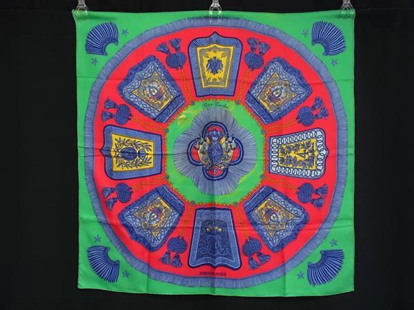 > 1円 HERMES エルメスPoste et Cavalerie【サーベル飾袋】カレ90 シルク100% 大判 スカーフ ストール ショール グリーン系 FT2240