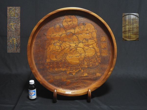 - 飾盆 風雲作 両面彫 盆 木彫 相撲図 飾台付 【送料無料】